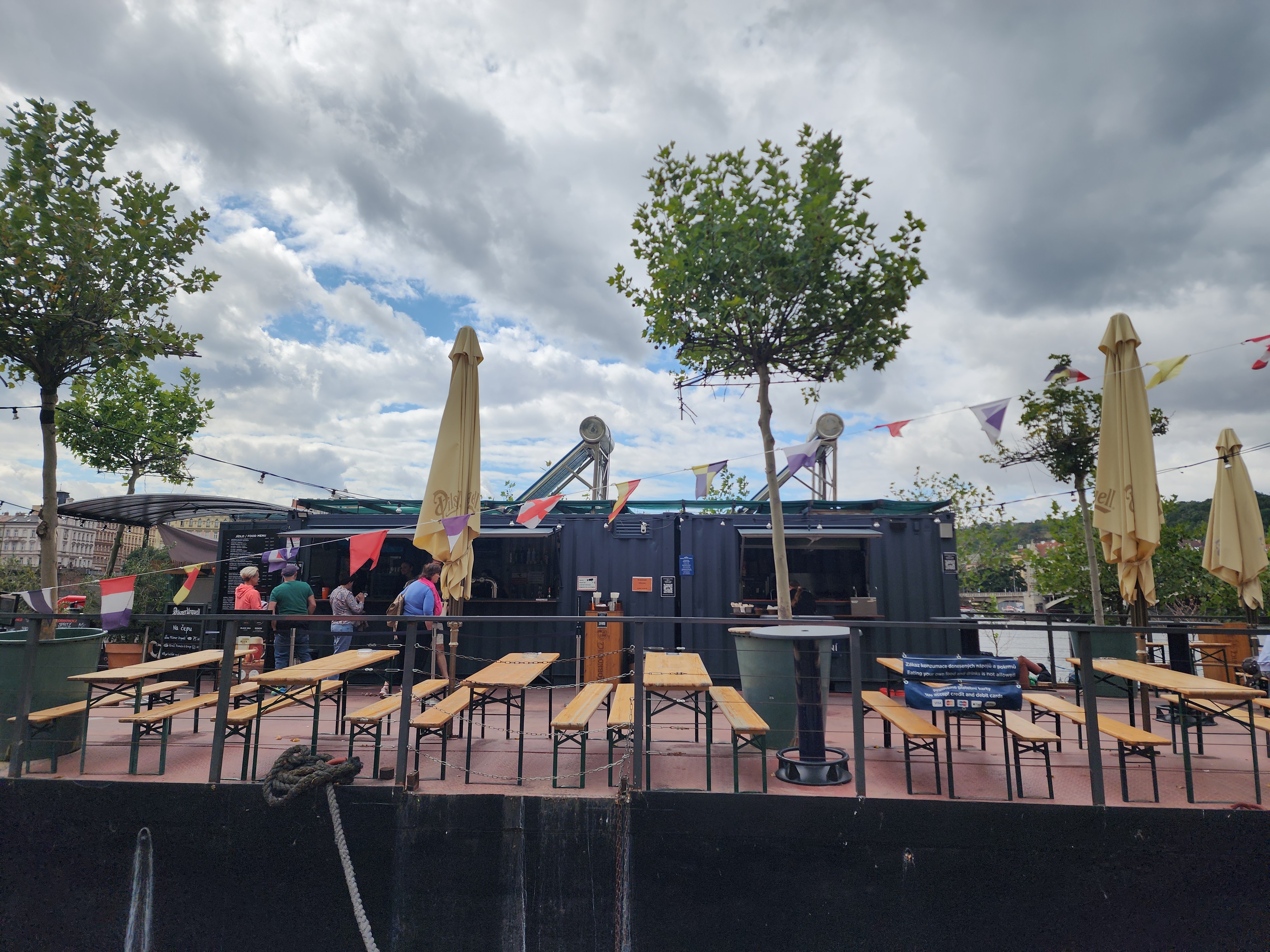 프라하 구시가지 쪽을 한참 걷다가 강 쪽으로 내려가 보니, 생각지도 못한 장면이 펼쳐졌습니다. 강을 따라 낮게 이어진 둔치 공간에 작은 카페와 바들이 띄엄띄엄 자리하고 있었고, 그 앞에는 사람들이 삼삼오오 모여 앉아 맥주를 마시거나 이야기를 나누고 있었습니다.