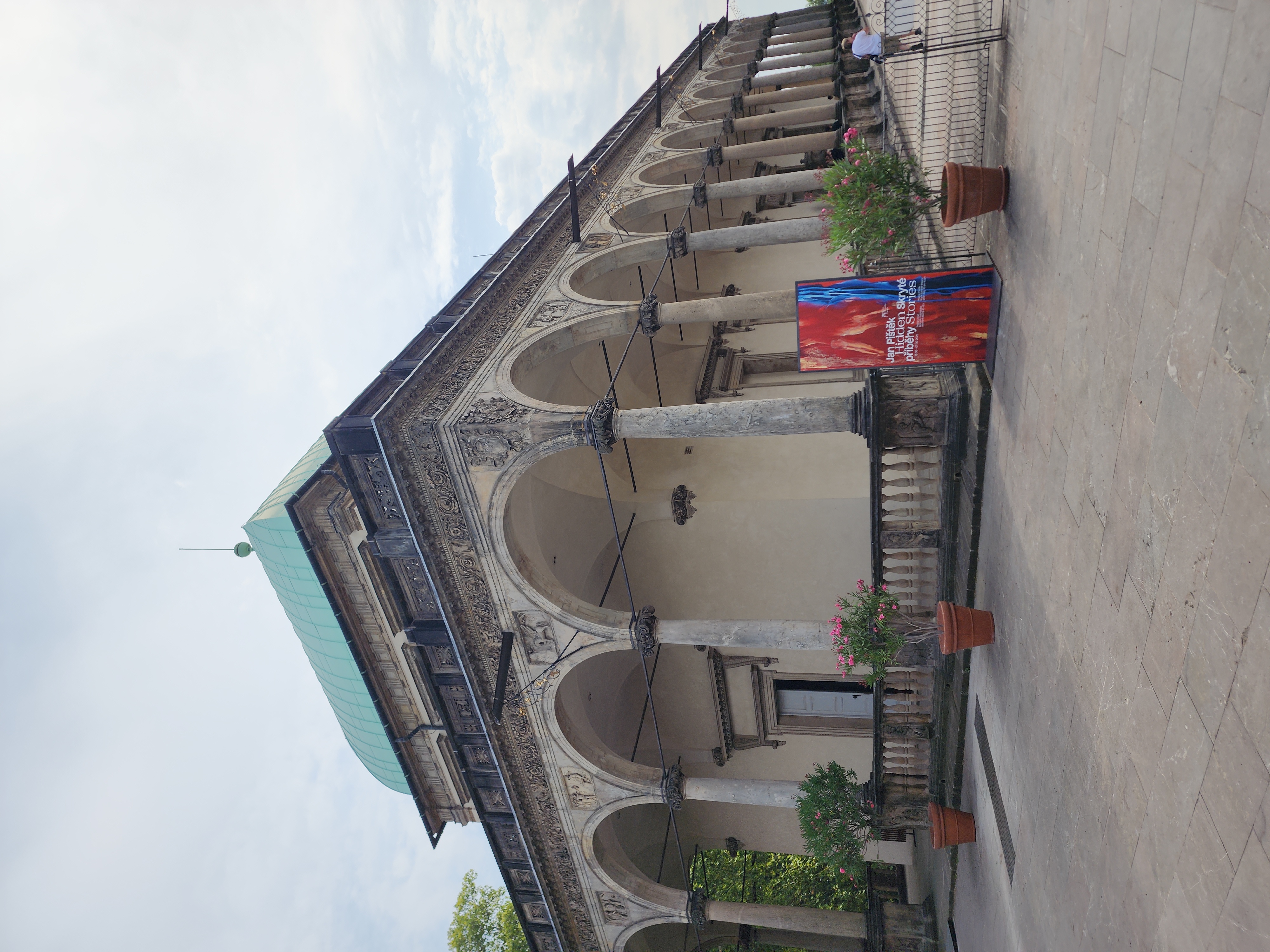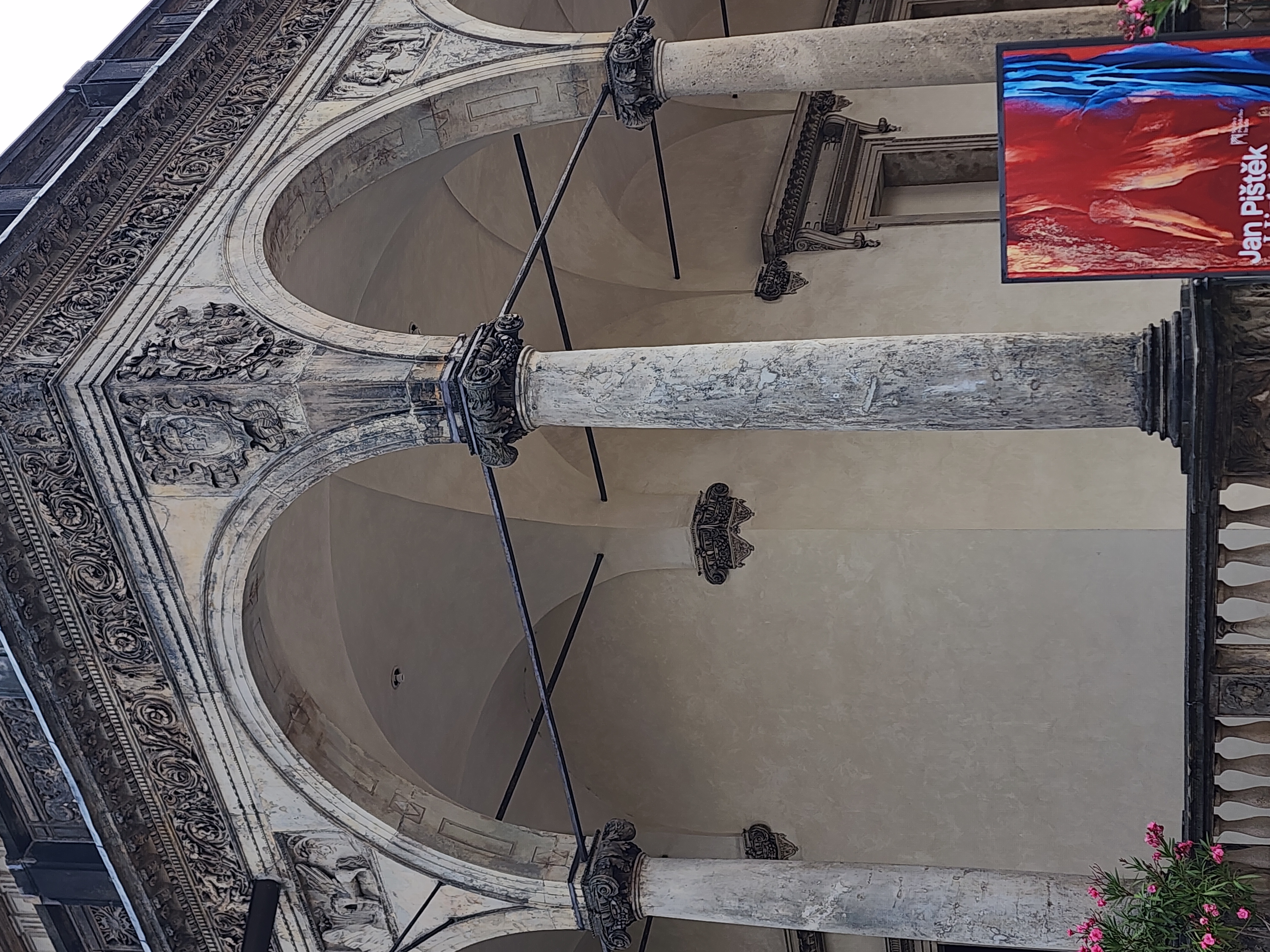 가까이 다가가 보니 건물의 분위기는 프라하성 내부의 고딕 양식 건물들과는 사뭇 달랐습니다. 화려하기보다는 균형 잡히고 단아한 아름다움이 느껴졌습니다. 아치형 회랑이 건물을 둘러싸고 있었고, 지붕은 부드럽게 곡선을 이루고 있었습니다. 건물 아래층을 따라 이어진 기둥과 장식은 이탈리아 르네상스 양식의 영향을 강하게 보여주고 있었습니다.