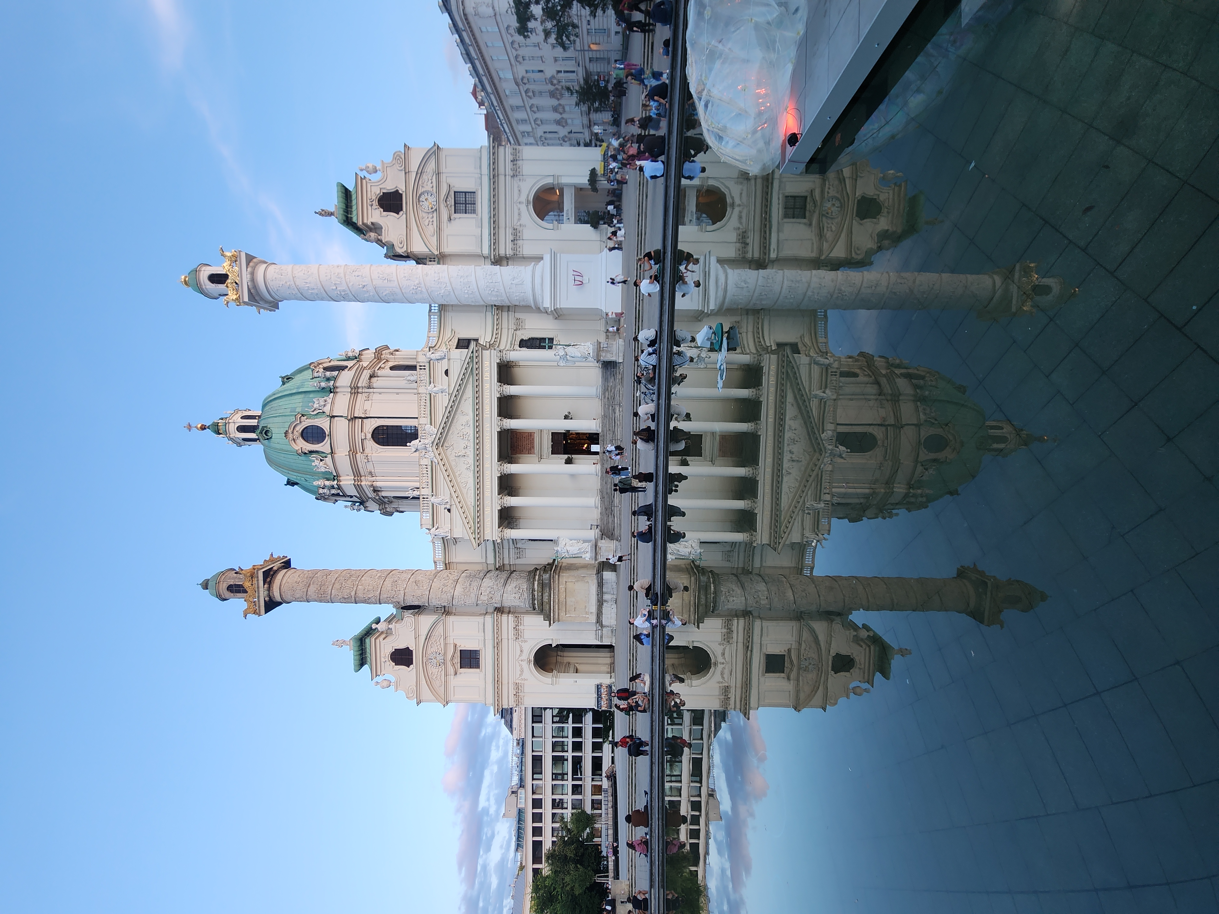도착 첫날의 기억도 인상적입니다. 긴 이동 끝에 숙소에 짐을 풀고, 저녁 무렵 가볍게 산책을 나섰습니다. 그날은 멀리까지 가지 못하고, 성당 하나를 우연히 마주했을 뿐이었습니다. 물에 비친 성당의 반영이 참으로 아름다워 사진을 몇 장 찍었는데, 그 성당의 이름조차 정확히 알지 못합니다. 비엔나에는 크고 작은 성당이 많기 때문에, 아마도 시내 중심부 근처의 교회였을 것입니다. 여행이라는 것이 꼭 이름을 아는 곳만 기억에 남는 것은 아니더군요. 오히려 그날의 공기, 해 질 녘의 빛, 물 위에 흔들리던 첨탑의 그림자가 더 또렷하게 떠오릅니다.