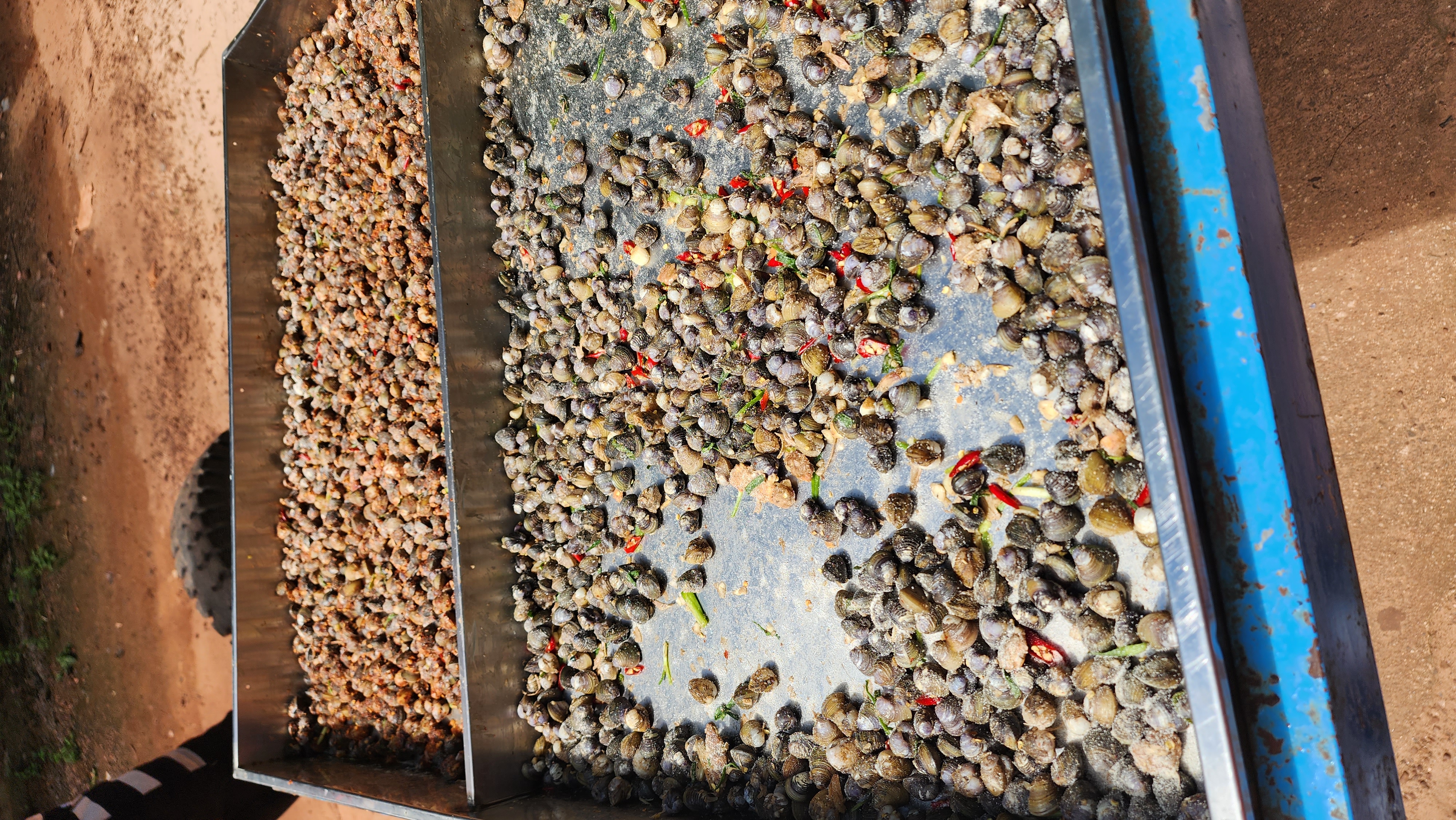 민물조개를 잡아 양념을 해놓은 요리인지 밖에 파리만 들끓고 있었어요.